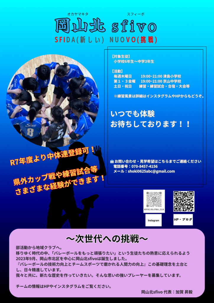 移りゆく時代の中、「バレーボールをもっと頑張りたい」という生徒たちの熱意に応えられるよう2023年9月、岡山市北区を中心に岡山北sfivoは誕生しました。